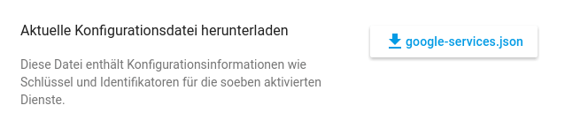 Im app/ Verzeichnis erstellen wir im ersten Schritt eine neue Datei google-services.json. Den Inhalt für diese Datei beziehen wir aus Firebase Console. Unter Projekteinstellungen findet sich dazu ein Download Button: