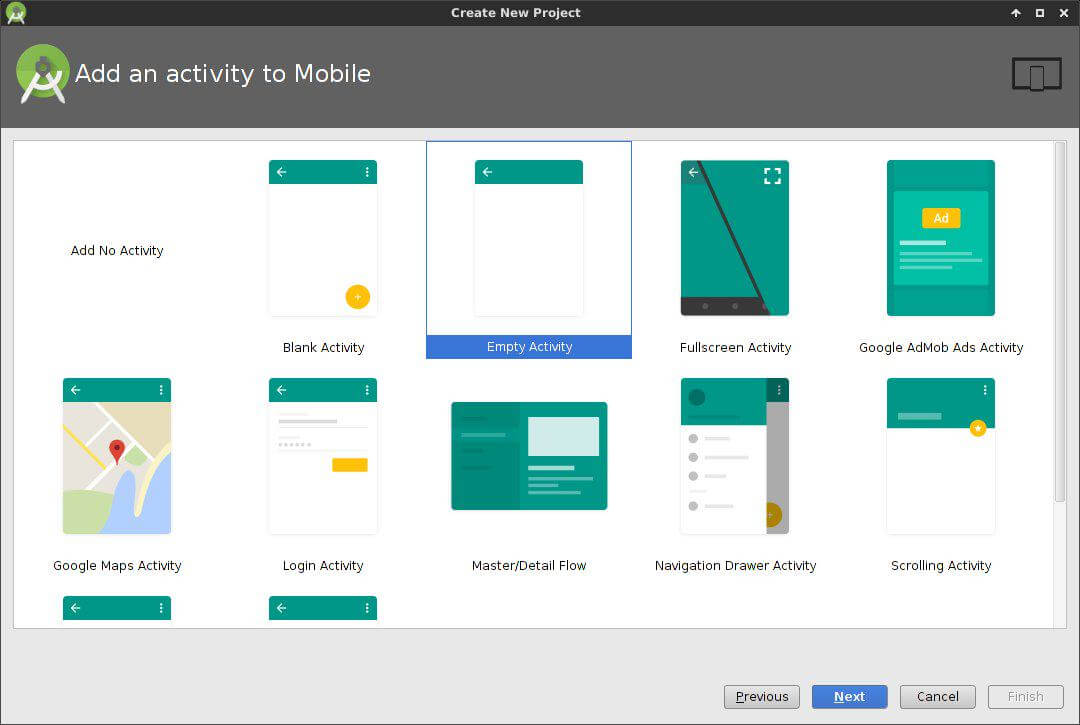 Im letzten Artikel habe ich euch bereits die ersten beiden Schritte bei der Erstellung einer neuen App gezeigt. Im dritten Schritt muss man sich eine Vorlage aussuchen. Das Android Studio bietet jede Menge fertiger Vorlagen, für unsere erste App reicht eine leere Activity.