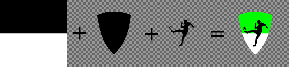 Das Bild zeigt sehr schön wie das fertige Bild aufgebaut sehr könnte. Zuerst wählt der Benutzer ein Muster, hier einfach zwei Farben mit der Trennung in der Mitte. Danach wählt man eine Form. Zusätzlich kann man noch Details setzen (das wäre in diesem Fall der Fußballer). Das Bild besteht aus 3 Layer und man kann 3 unterschiedliche Farben (2 für das Muster und eine für die Details) wählen.