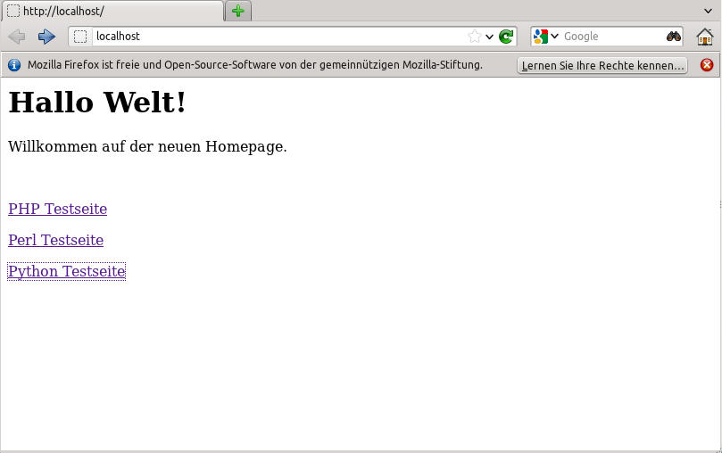 Gibt man nun also im Browser www.meinedomain.com/Testapplikation ein, so wird die Anfrage nicht an den Tomcat weitergeleitet, sondern direkt vom Apache Webserver übernommen. Bei mir liegt die Testapplikation im Standardverzeichnis /var/www.