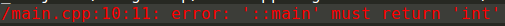 Beim Anlegen eines neuen Projekts damals unter Visual Studio und Windows wurde die main Methode passend für Windows erzeugt. Unter Linux muss jedes Programm einen Statuscode zurückgeben. Das ist normalerweise 0, beziehungsweise im Fehlerfall eine Nummer höher als 0 (das entspricht dann der hoffentlich dokumentierten Fehlernummer). Die Lösung ist nun aus einem: