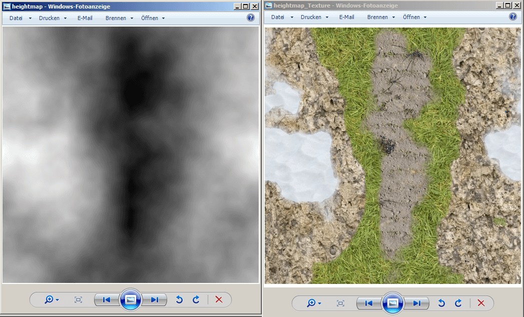 Wenn man sich beim Programm durcharbeitet bekommt man als Ergebnis mehrere Bilder. Darunter eine Höhenkarte des erstellten Terrains und eine texturierte Version, die man rein theoretisch bereits für die Simulation verwenden könnte.