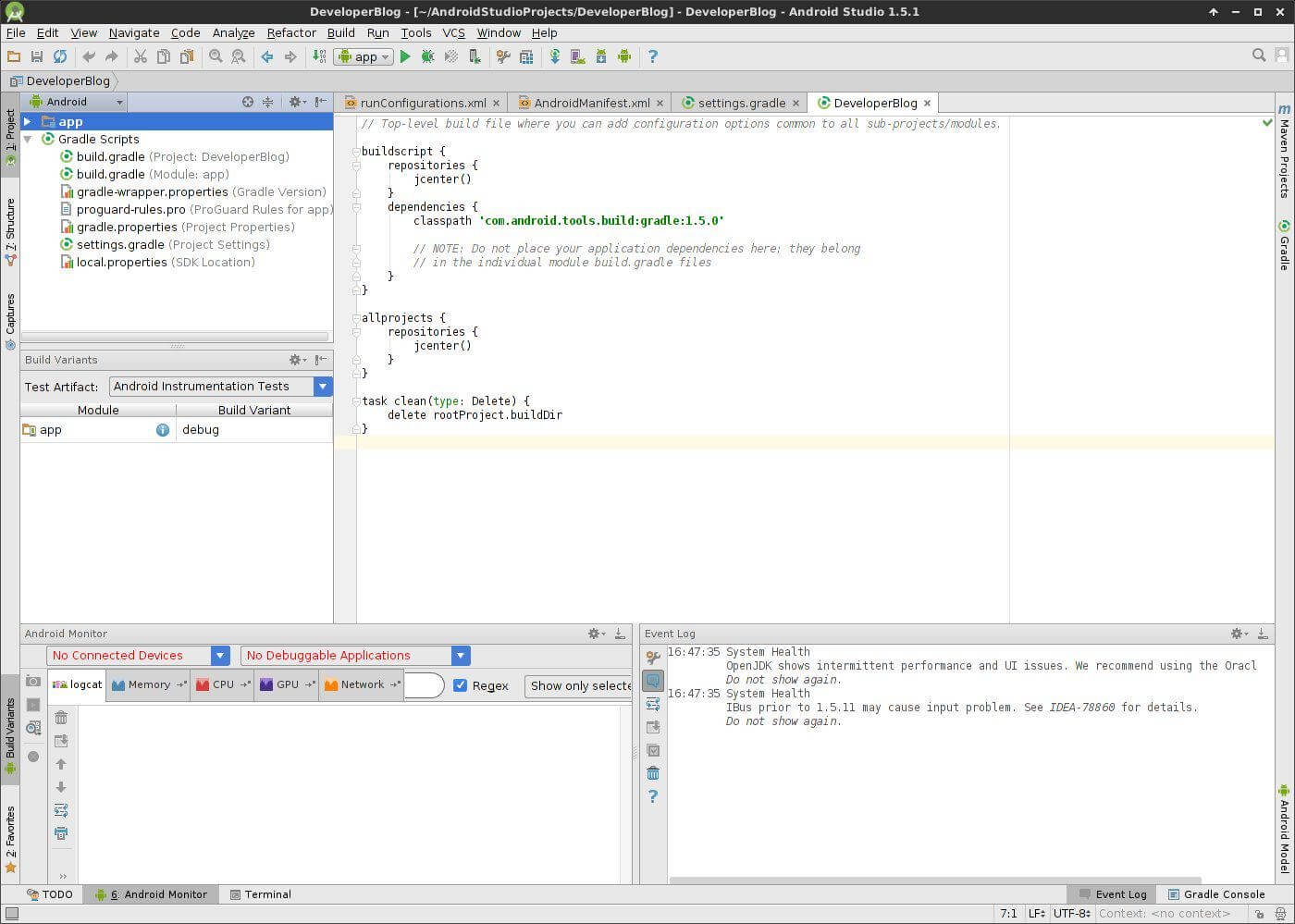 Bevor man noch die ersten Zeilen Code schreibt benötigt man ein Entwicklungsprogramm. Man könnte zwar alles in beliebigen Texteditoren schreiben und danach über eine Kommandozeile erstellen, bei Android ist das aber ein wahnsinniger Aufwand. Vor Jahren musste man für die Android Entwicklung noch ein Plugin für Eclipse installieren. Die Konfiguration war da schon die erste große Hürde und kostete Anfänger oft viele Stunden. Heute gibt es mit dem Android Studio eine fertige IDE die man installiert und bei der bereits alles integriert und konfiguriert ist. So viel Komfort gab es in der App Entwicklung zuvor nur bei Apple. Ein Screenshot meiner Developer Blog App in der Entwicklung…
