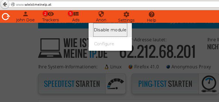 Bis jetzt konnte der eBlocker nur Werbung (Ads) und Tracker abhalten. Als Benutzer war man immer noch eindeutig über die eigene IP Adresse identifizierbar. Ende September wurde die Early Bird Version 0.7.5 der Software veröffentlicht. Diese habe ich wieder heruntergeladen und aufgespielt. Nun ist es Möglich das Tor Netzwerk zur Anonymisierung zu verwenden. Dabei werden die Daten der aufgerufenen Webseite zufällig durch dieses Netzwerk geschleust, man hat von außen Betrachtet eine andere IP Adresse. Welche Adresse ist dabei zufällig – sie ist fast nicht mehr auf die eigene Person zurückzuführen. Bei meinem ersten Test hatte ich eine französische IP. Den Anonymisierungsdienst kann man jederzeit von jedem Gerät im selben Netzwerk ein- bzw. ausgeschaltet werden. Mit eingeschaltetem Tor habe ich beispielsweise folgende IP Adresse: