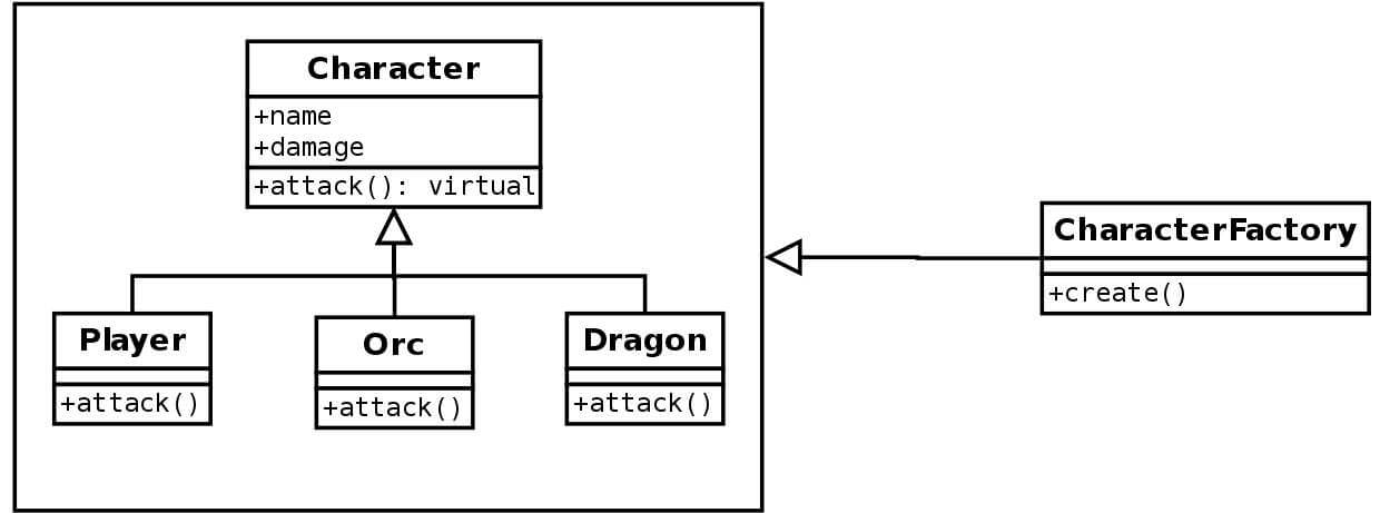 };Basis des Patterns ist die CharacterFactory mit der dort implementierten create Methode. Diese ist static, kann also ohne Instanz der Klasse aufgerufen werden. Man erhält ein Objekt vom Typ der Basisklasse Character. Durch diesen Pointer kann man auch jegliche Spezialklasse (Player, Orc oder Dragon) als Objekt zurück erhalten (genau genommen nur den Pointer auf die Adresse im Speicher). Die Methode wurde so implementiert:
