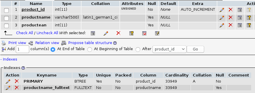 Die einzige Bedingung für die gewichtete Suche einer Spalte der Tabelle ist ein gesetzter FULLTEXT Index. Diesen kann man beispielsweise mit PhpMyAdmin auf der Tabellen Struktur Seite setzen. Das könnte dann so aussehen:
