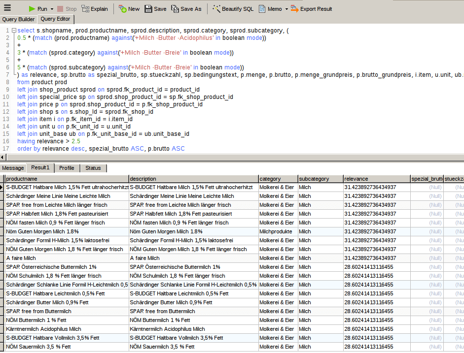 0.5 * (MATCH (name) AGAINST ('+Milch' IN BOOLEAN MODE))0.5 ist die Gewichtung. Diese muss man selbst festlegen und ist abhängig davon wie wichtig diese Spalte im Suchergebnis sein darf. Danach folgt mit MATCH die Spalte der Tabelle und mit AGAINST das gesuchte Wort. IN BOOLEAN MODE bedeutet, dass wir mit + und – vor dem Suchbegriff festlegen können ob das Wort gefunden werden muss. Beispielweise könnten wir mit einem zusätzlichen „-Schokolade“ Ergebnisse mit „Milch-Schokolade“ entfernen.