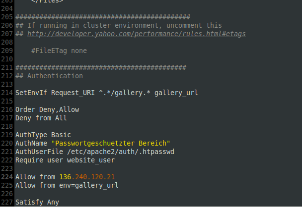 Ein Verzeichnisschutz ist eine tolle Sache. Dieser wird aber mühsam, wenn man sich mehrmals täglich einloggen muss oder noch schlimmer über automatische Systeme auf die Seite zugreifen muss (man denke an Schnittstellen wie SOAP). Für diesen Fall kann man den Verzeichnisschutz für bestimmte IP Adressen oder IP Adressbereiche deaktivieren, also den Zugriff erlauben. Das funktioniert wie folgt: