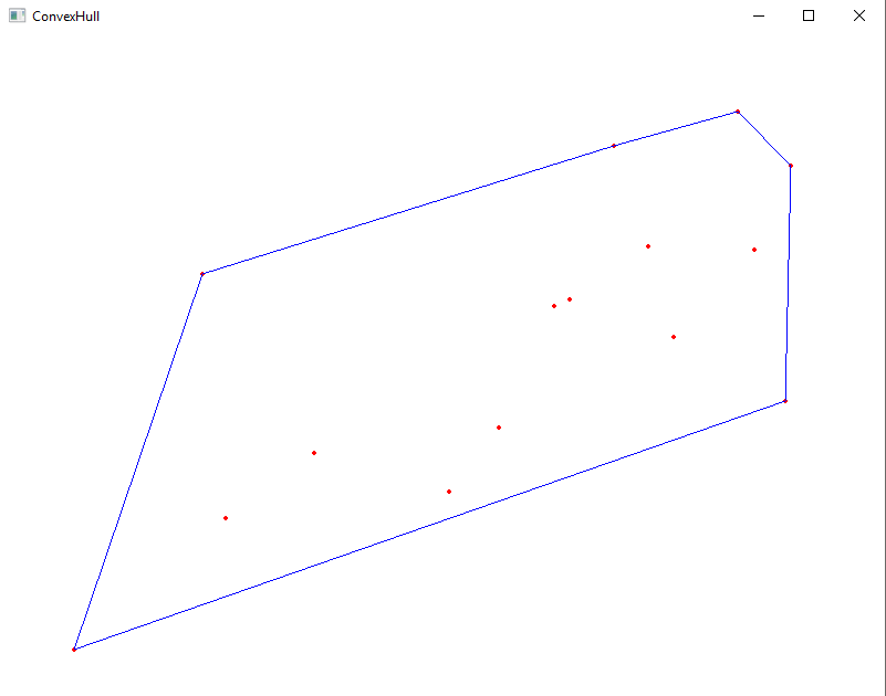 Wie immer findet man den Source Code für dieses Beispiel auf meiner GitHub Seite. Die grafische Darstellung ist mit der ClanLib Engine implementiert. Die grafische Ausgabe zeichnet in einem Fenster mit weißem Hintergrund die Punkte in rot mit einer blauen konvexen Hülle.