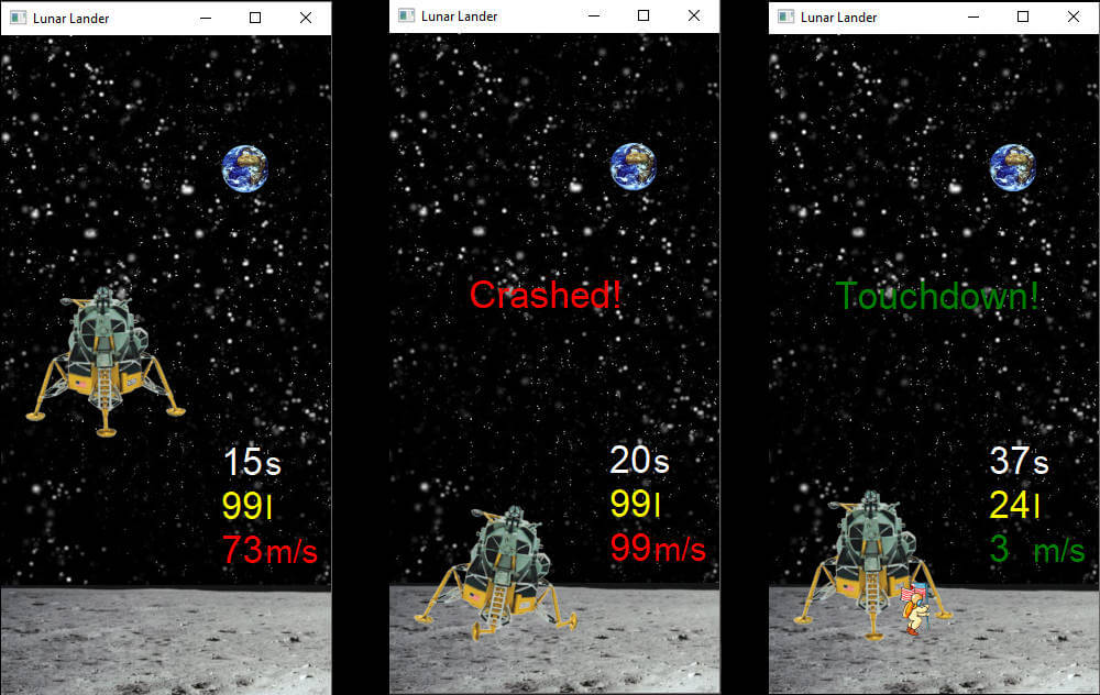 Der große Abschluss der Lehrveranstaltung Physik war die Implementierung von Lunar Lander in C++. In diesem einfachen Spiel geht es darum, eine Raumfähre auf dem Mond zu landen.Dabei spielt zum einen die Anziehungskraft des Erdtrabanten eine Rolle und zum anderen der verfügbare Tank der Raumfähre. Passend zur Landung der chinesischen Sonde auf der Erdabgewandten Seite vom Mond könnt ihr das schwierige Landemanöver ebenfalls versuchen. Nur mit gutem Timing schafft man die Landung.