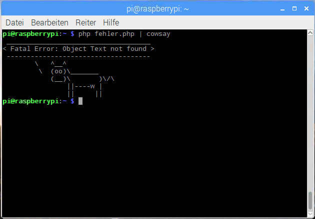 Sinnlos? Nun ja, man cowsay aber auch noch über Pipes verwenden, weshalb das Programm durchaus seine Berechtigung hat. Ist man ein etwas kreativer Administrator, dann könnte man beispielsweise Fehlermeldungen der Konsole direkt an das cowsay Programm weiterleiten. Ein einfaches Beispiel könnte so aussehen: