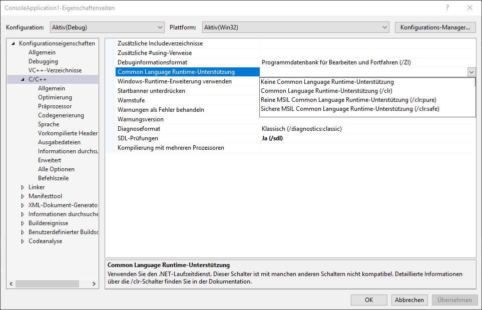 Als Programmierer wird man sich wenig Gedanken machen wo Code wie ausgeführt wird. Unter Visual C++ gibt es jedoch die Möglichkeit, dass man externen C# Code ins C++ Projekt einbinden kann – das funktioniert mittels dem Compilerflag „/clr“ (Commond Language Runtime).