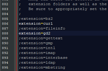Die php.ini Datei ist zwar sehr lang, enthält aber bereits viele auskommentierte Beispielkonfigurationen. Außerdem finden sich sehr viele Kommentare und vieles ist selbsterklärend. Relativ mittig findet sich eine lange Liste an Extensions die alle deaktiviert sind (ein ; vor dem Befehlt). Um GD2 und andere Extensions zu aktivieren muss man lediglich das Semikolon in der ersten Spalte entfernen. Danach muss die Datei noch im Administrationsmodul (weil unter C:) abgespeichert werden.