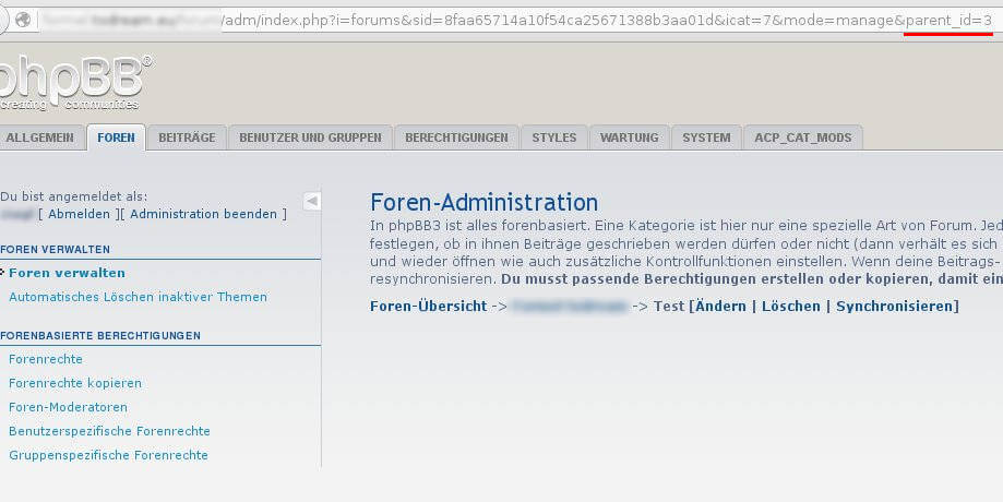 Zuletzt benötigt man für automatische Posts mit phpBB noch ein Array mit Einstellungen. Besonders wichtig ist dabei die Angabe der $forum_id, unter diesem wird der Post erstellt. Die ID des Forums bekommt man aus der Datenbank oder aus der URL im Administrationsbereich von phpBB wie das folgende Bild verdeutlicht (man muss zuerst auf das Forum – in meinem Fall Test klicken)…