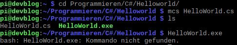 Bei der Installation von Mono werden jede Menge Tools installiert. Eines davon ist der Compiler, den wir mit dem Befehl mcs aufrufen. Das Beispiel wird wie folgt kompiliert: