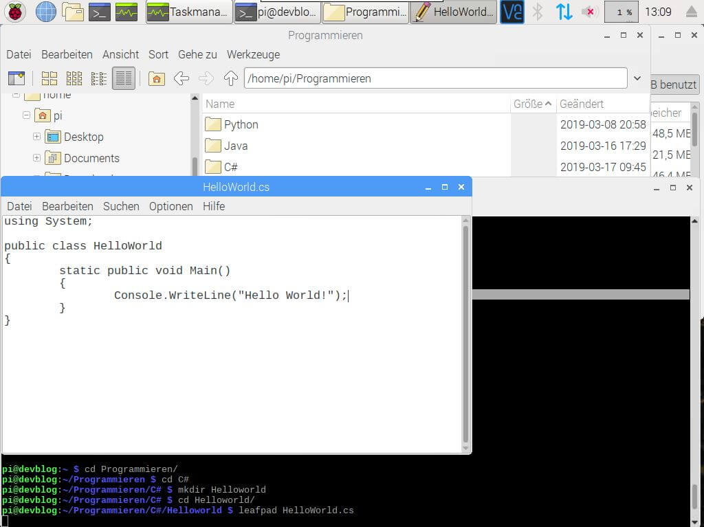 Ähnlich wie zuletzt bei meinem Raspberry Pi Java Artikel legen wir uns ein neues Verzeichnis für den Source Code an und erstellen unsere erste Klasse mit einem beliebigen Texteditor (ohne IDE). Ich habe mein HelloWorld in leafpad geschrieben: