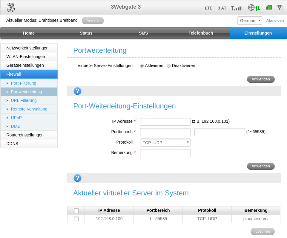 Sobald ihr eingeloggt seid müsst ihr nach dem Menüpunkt Portweiterleitung suchen und hoffen, dass dieser für euch nicht gesperrt wurde. Bei diesem Einstellungspunkt könnt ihr alle Ports für die IP Adresse eures Servers weiterleiten. Ich habe das für meinen Raspberry Pi (die IP Adresse 192.168.0.100) eingestellt. Sobald alles funktioniert könnt ihr dann nur spezifische Ports freigeben. Man kann recht kreativ sein und einzelne Ports auf unterschiedliche IP Adressen weiterleiten, so könnte man beispielsweise den FTP Port 20 für das Raspberry Pi NAS freigeben oder Port 25565 für einen Minecraft Server. Bei mir sieht die Konfiguration so aus: