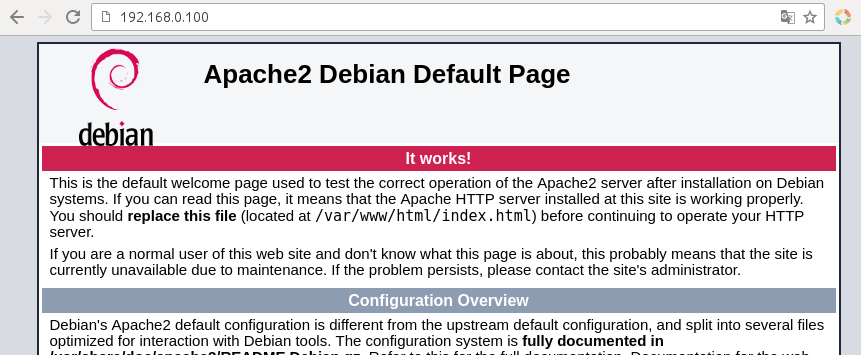 Für meine Zwecke habe ich mir auf einem Raspberry Pi im eigenen Netzwerk einen Webserver erstellt. Dieser soll über das DDNS von außen erreichbar sein und später mal als Entwicklungs- und Testserver dienen. Die Konfiguration habe ich aus meinem Raspberry Pi Webserver Artikel übernommen. Über die IP Adresse vom Raspberry Pi, in meinem Fall 192.168.0.100 ist im Browser aktuell die Apache Standardseite zu sehen: