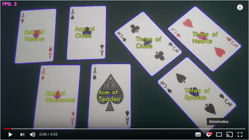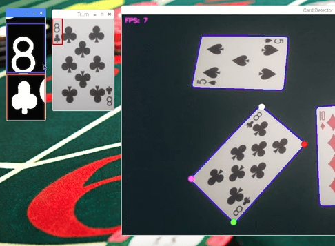 Der beschrieben Mustervergleich muss in diesem Fall für jede einzelne Karte im Bild für alle Muster pro Frame gemacht werden. Das entspricht einer starken Belastung für eine CPU und erfordert große Rechenkapazität. An der angezeigten FPS (Frames per second) Zahl ist ersichtlich, dass sich selbst der Raspberry Pi 3 dabei sehr anstrengen muss.