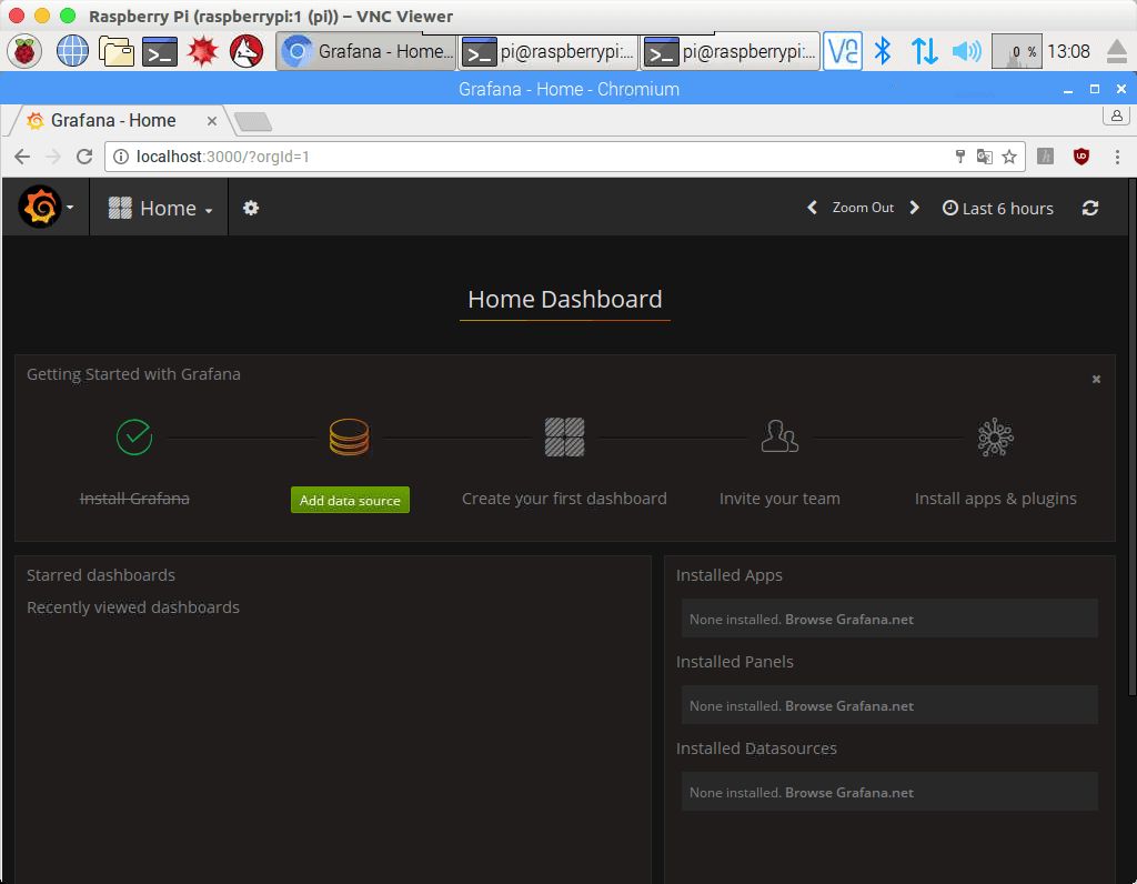 Grafana bietet zahlreiche Möglichkeit auf dessen Daten zuzugreifen. Es gibt beispielsweise eine API über die man sich die Auswertungen zahlreicher Systeme auf eine zentrale Stelle zusammenstellen lassen kann. Zusätzlich hat jeder Server ein eigenes Webinterface. Am Raspberry Pi kann man sich lokal (oder über das Netzwerk von einem externen Rechner) diese Daten ansehen. Das Webinterface ruft man standardmäßig im Browser mit: