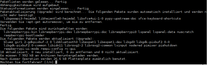 Durch das && werden die beiden Kommandos update und upgrade hintereinander ausgeführt. Sobald die Ausgaben vom upgrade Schritt angezeigt werden und es aktualisieren gibt wartet das Terminal auf eine Bestätigung durch den Benutzer: