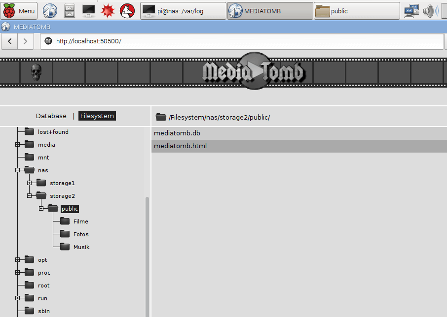 MediaTomb bietet ein Webinterface an auf dem man die Medien verwalten kann. Intern wird da eine Datenbank angelegt, in der die Informationen gespeichert werden. Dieses Interface ist unter http://localhost:50500 beziehungsweise von einem anderen Computer im Netzwerk über http://nas:50500 beziehungsweise http://IP-ADRESSE-VOM-NAS:50500 im Browser erreichbar.