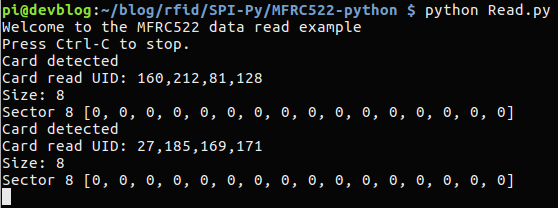 Stunde der Wahrheit. Wenn ihr alles korrekt ausgeführt habt, dann könnt ihr über das Read.py Skript die RFID Tags bereits auslesen: