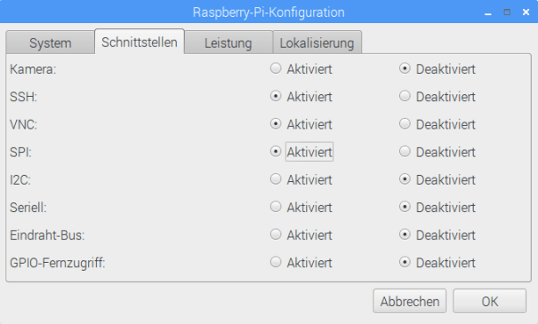 Bevor man beginnt muss man am Raspberry Pi das SPI Interface aktivieren. Dieses ist standardmäßig (nach einer Installation von Raspbian Linux) deaktiviert. Aktiviert wird es über das raspi-config Konsolenprogramm oder über das grafische Tool am Desktop. In beiden Fällen ist ein Neustart nötig.