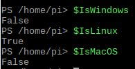 Weil die PowerShell nun auf jedem Betriebssystem läuft und man auch direkt über SSH remote auf eine PowerShell zugreifen kann wird es nun wichtig, dass wir das Betriebssystem abfragen können. Die Shell bietet dafür drei Variablen an die je nach System korrekt ausgefüllt sind. Am Raspberry Pi sieht das beispielsweise so aus: