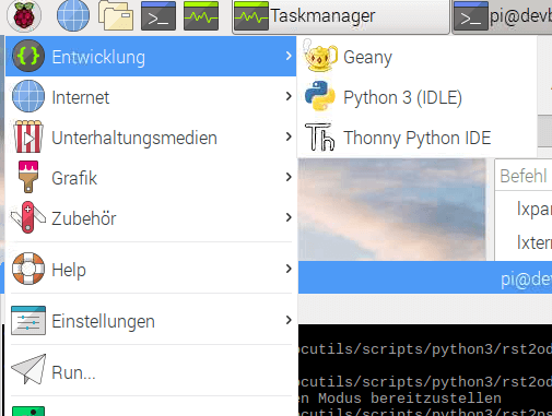 Nach einigen Minuten ist die Entwicklungsumgebung und alle Abhängigkeiten installiert. Das Programm kann über ein neues zusätzliches Icon im Raspbian Startmenü gestartet werden. Bei mir sieht der Punkt Entwicklung wie folgt aus: