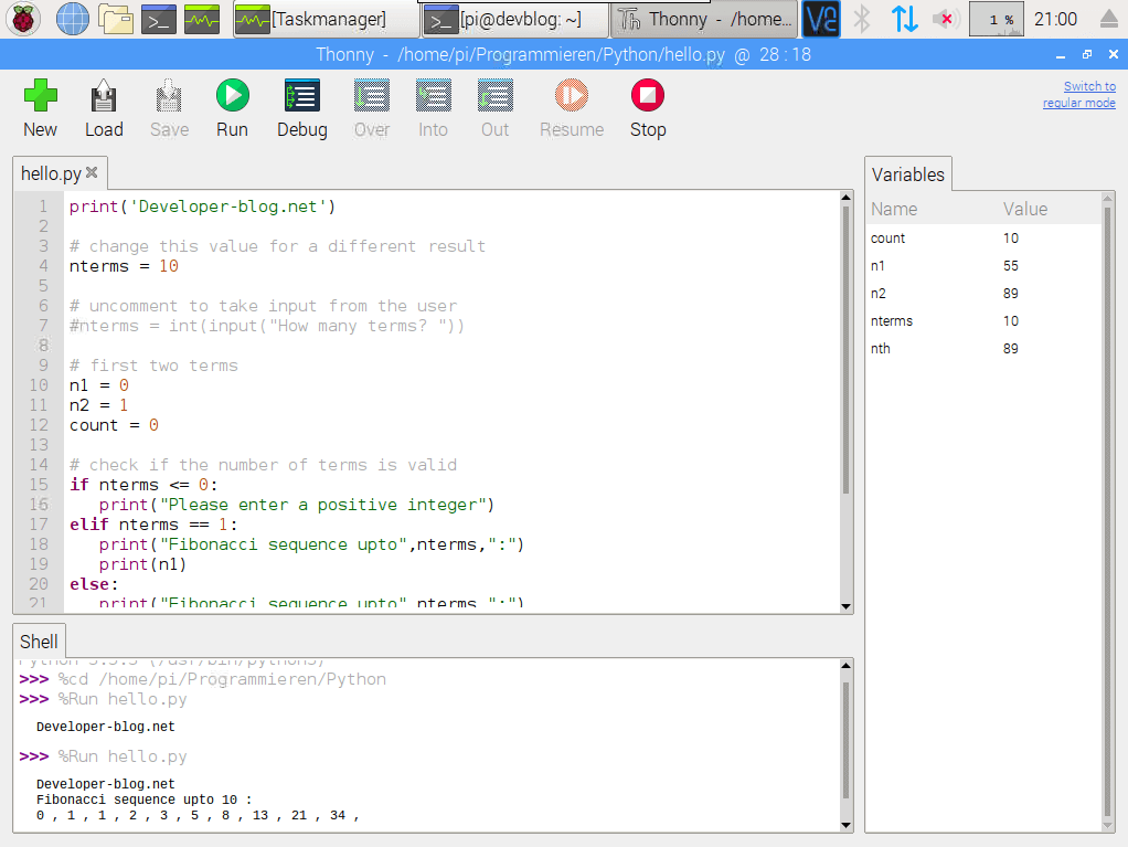 Raspbian Linux kommt in der einfachsten Desktop Version bereits mit der Python IDE Geany. Öffnet man diese und vergleicht sie mit Thonny ist auf den ersten Blick bereits eine komplexere Oberfläche auffällig. Der Python Anfänger könnte sich von der großen Zahl an Fenstern und Steuerelementen erschlagen fühlen. Für ein paar Zeilen Code schon fast zuviel. Thonny ist im Vergleich dazu in der Tat die für Anfänger deutlich freundlichere Arbeitsumgebung.
