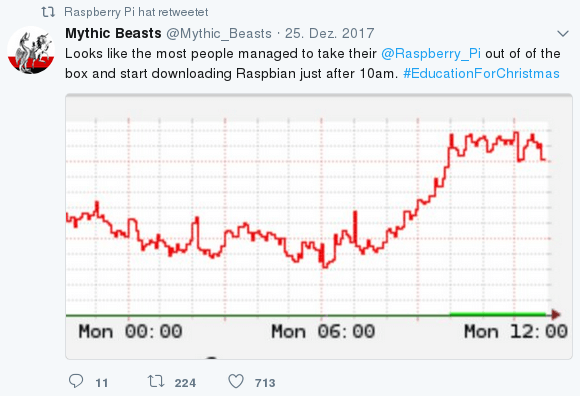 Die Zahl an Raspbian Downloads zu Weihnachten stieg dramatisch an. In einem Twitter Post vermeldete man einen Anstieg von Downloads des Raspberry Pi Betriebssystems. Die Zahl an neuen Pi und Pi Besitzern steigt also auch aktuell noch weiter an. Weiter so!