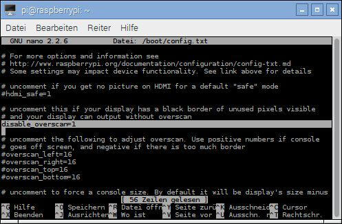 dieser ist dank dem # Zeichen deaktiviert und wird beim Bootvorgang ignoriert. Wir entfernen nun das Kommentarzeichen und speichern die Datei. Von nun an sagt disable_overscan=1, dass die Overscan Funktion für alle Bildschirme deaktiviert ist.