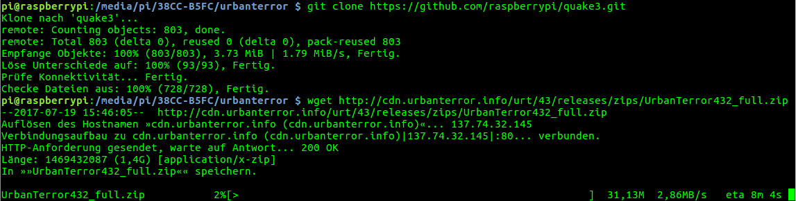 Wir benötigen für das Spiel die originalen Daten. Diese gibt es entweder auf der CD Rom von Quake 3 oder beispielsweise über den folgenden Link. Ich habe mir diese am Pi in einen eigenen Ordner baseq3 geladen. Die Files findet man unter http://files.anitalink.com/gamecache/quake3/baseq3/. Der baseq3 Ordner gehört dann in den UrbenTerror43 Ordner.