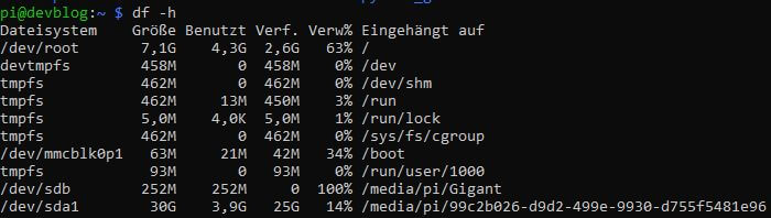 Eine einfache und billige Methode sind USB Sticks. USB Flash Speicher sind günstig, man bekommt sie sogar oft als Werbegeschenk. Der Pi hat 4 USB Steckplätze, von denen man im headless Betrieb keinen einzigen benötigt. Genug Platz also um bis zu 4 weitere Speichergeräte anzuschließen. Für den Testfall habe ich mir 2 super kleine USB Speicher mit jeweils 32 GB gekauft. Wenn beide eingesteckt sind zeigt mir das System genug freien Speicher an: