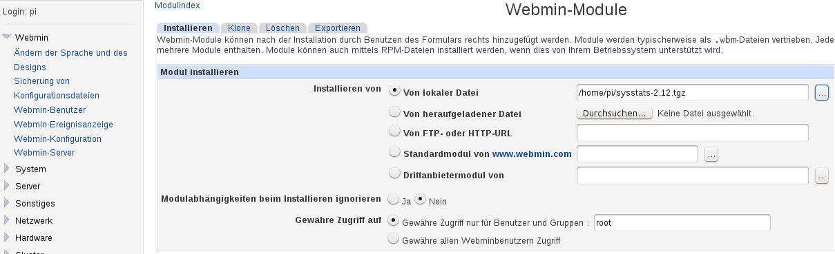 Webminstats gibt es auf SourceForge zum Download. Das Modul kommt als gepacktes Archiv. Man kann dieses direkt über die Weboberfläche von Webmin installieren, auch vom Laptop im selben Netz. Das Archiv muss dafür aber bereits am Dateisystem vom Raspberry Pi liegen, man kann nicht wie bei anderen Diensten im Formular eine Datei auf den Server hochladen. Alles nötige dazu findet man unter Webmin -> Webmin-Konfiguration -> Webmin-Module.