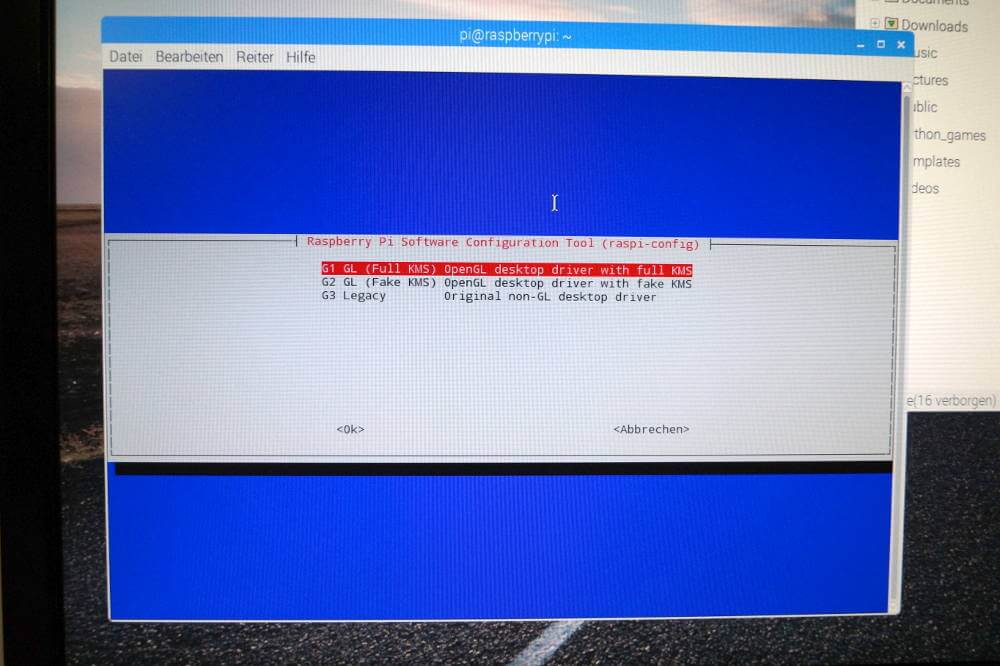 Zusätzlich kopiere ich auch noch meinen Lizenzschlüssel in mein Heimatverzeichnis. Laut Anleitung müssen wir vor der Installation sicherstellen, dass der Open GL Driver im raspi-config aktiviert ist. Dafür gehen wir im raspi-config unter „Advanced Options“ auf den Punkt GL Driver und aktivieren G1 GL (Full KMS):