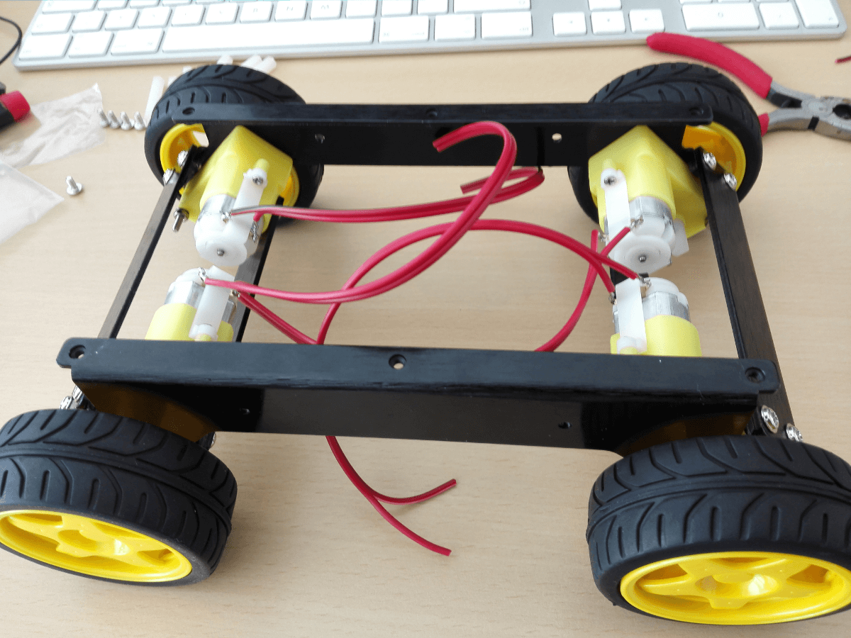 Nachdem alle 4 Motoren montiert und alle Kabel angelötet sind braucht man den Rest vom Chassis nur noch zusammen zuschrauben. Danach kann man die Plastikreifen direkt an den Motor anstecken. Dazu ist etwas Kraft notwendig.