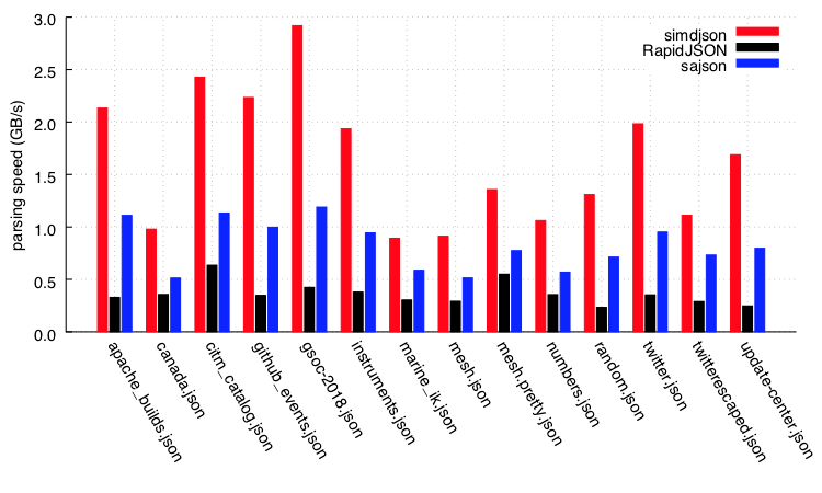 Mit bis zu 2,2 GB/s stellt simdjson einen neuen Rekord an verarbeiten Daten pro Sekunde auf aktuellen Skylake Prozessoren auf. Eine detaillierte Grafik dazu zeigt die Performance der Bibliothek im Vergleich zu anderen üblichen Bibliotheken am Beispiel von mehreren Testdateien: