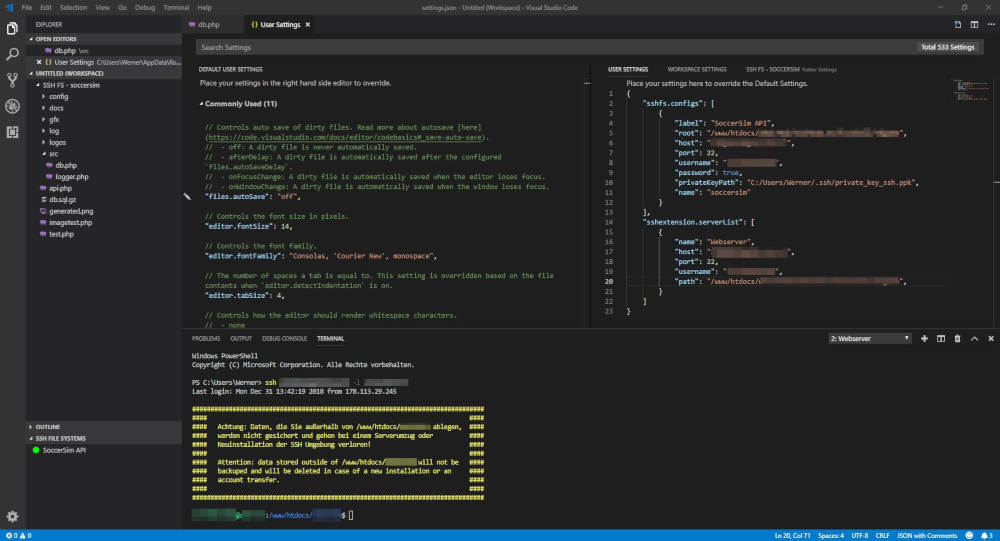 Dank Plugins kann man Visual Studio Code auch um SSH Verbindungen zu Webservern erweitern. Im Terminal kann man zwischen lokalem und externen Arbeitsbereich wechseln. Gerade für die PHP Entwicklung direkt am Webserver ist diese Extension zu empfehlen. Man kann die IDE als vollwertige Full Stack Entwicklungsumgebung verwenden. PHP am Server direkt entwickeln und gleichzeitig im Terminal den Webserver einrichten und administrieren. Alles Open Source und komplett ohne Kosten und nach dazu von Microsoft!