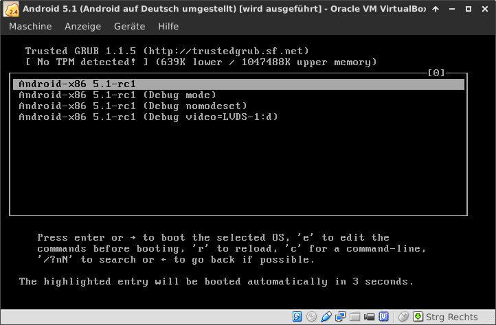 Die Virtuelle Maschine ist nun fertig konfiguriert und kann gestartet werden. Die virtuellen Festplatten sind 100 GB groß, jedoch so eingestellt, dass die tatsächliche Größe der Datenmenge entspricht. Das bedeutet auf der Festplatte des Hostsystems benötigt die VDI oder VMDK Datei sehr wenig Platz, kann aber im Fall von Android 5.1 bis zu 100 GB groß werden.