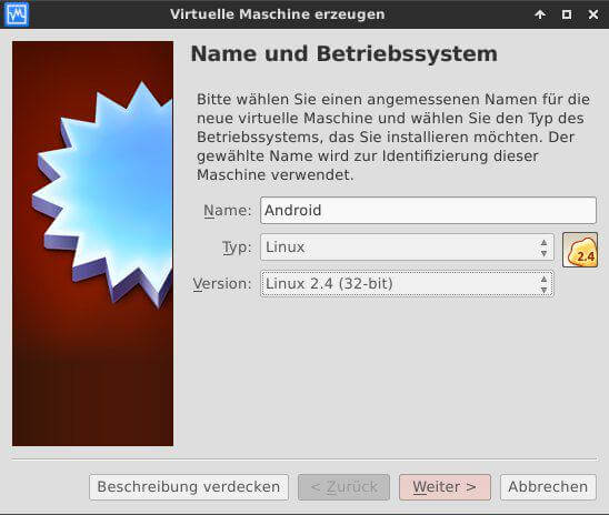 Bei der Anlage der neuen virtuellen Maschine wählt man einen passenden Namen wie etwa „Android“. Die wichtigen Einstellungen sind Linux als Betriebssystem und die Version Linux 2.4 (32-bit) damit die passenden Standardeinstellungen getroffen werden.