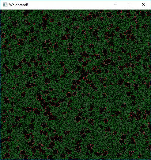 Die Regel mit dem Funkenflug ist eine kleine Schwindelei von uns Programmierern. Testet das Programm einfach mal ohne. Früher oder später wird das Feuer verschwunden sein und jedes Pixel mit Wald bewachsen sein. Die Natur findet immer einen Weg! Mit dem Funkenflug läuft die Simulation ewig.