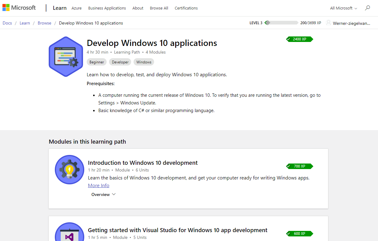 Rein zufällig bin ich über ein Werbung auf Twitter auf den Microsoft Kurs aufmerksam gemacht worden. Da es zufällig gerade zeitmäßig passte hab ich gleich mal den Windows 10 Programmierkurs durchgespielt. Das war auch gleich meine erste Bekanntschaft mit der Lernplattform von Microsoft. Der Kurs richtet sich auf Anfänger, die noch nie eine Windows App geschrieben haben oder nur erste Erfahrungen damit haben. Einzige Voraussetzung ist, dass man bereits C# programmieren kann. Da ich bislang nur unter C++ und Windows entwickelt hatte war der Kurs ideal um etwas mehr in die C# Welt (.NET Welt) einzutauchen.
