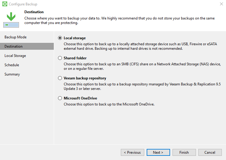 Weiter geht es nun mit dem Ziel auf dem die Sicherung erstellt werden soll. Auch in diesem Fall ist die wahrscheinlichste Lösung bereits aktiv. Auf einem lokalen Medium soll gesichert werden. Das sind alle aktuell von Windows erkannten Laufwerke, beispielsweise unsere USB Backup Festplatte oder ein zweites internes Laufwerk im Rechner. Alternativ dazu kann mit mit einem „Shared folder“ ein durch SMB freigegebenen Speicherbereich eines NAS sein oder eines Linux Servers. Reicht das immer noch nicht, dann gibt es mit einem Veeam backup repository eine eigene Lösung von Veeam, diese ist jedoch bereits eine kostenpflichtige Software für ein Unternehmen. Zuletzt könnte man auch noch die Microsoft Lösung über ein OneDrive verwenden, sofern man dort genügend Speicher hat. Auch das geht nur über eine kostenpflichtige Mitgliedschaft.